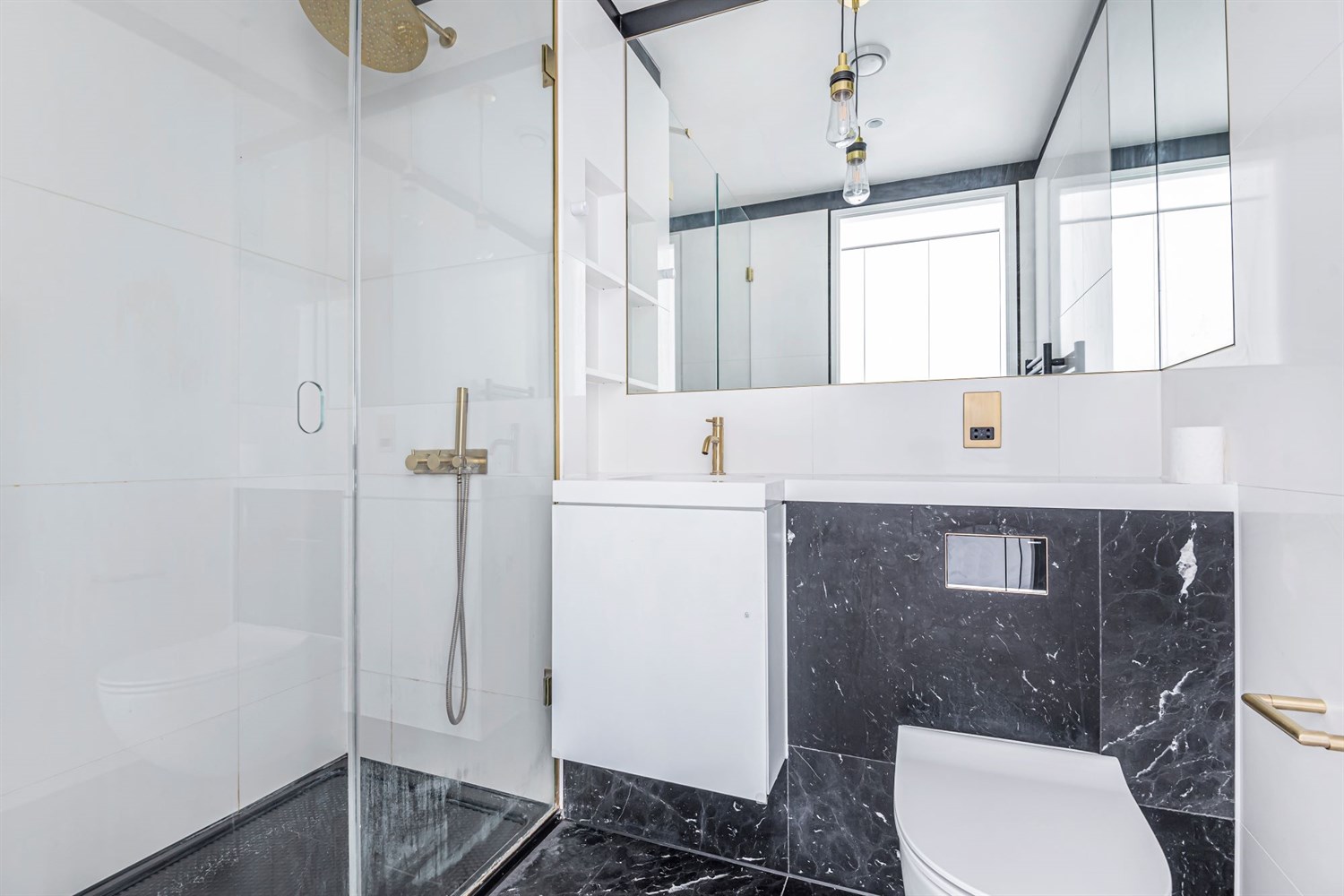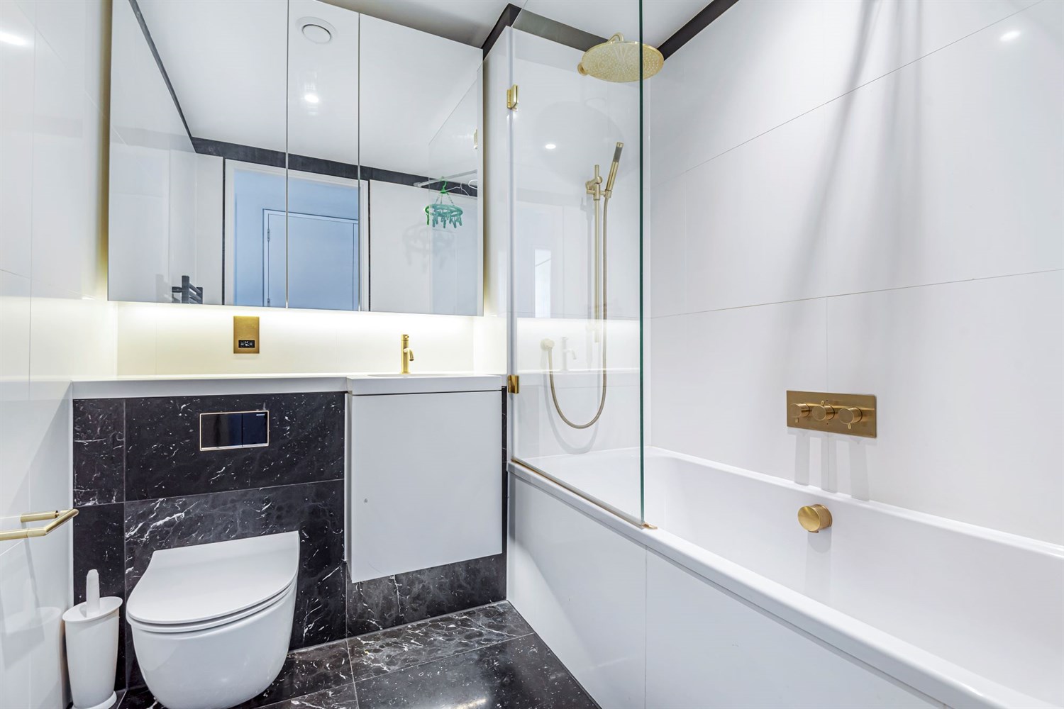 On entering this well-proportioned home you are immediately impressed with a wide entrance hall, built in utilities cupboard, the warm dark herringbone wood flooring with underfloor heating, and contrasting smart white woodwork. The interior design by Conran & Partners is inspired by the vibrancy of The Waterman's river and park side surroundings and the colours create bold monochrome contrasts with the tactile brushed brass splashback, taps and light fittings.
