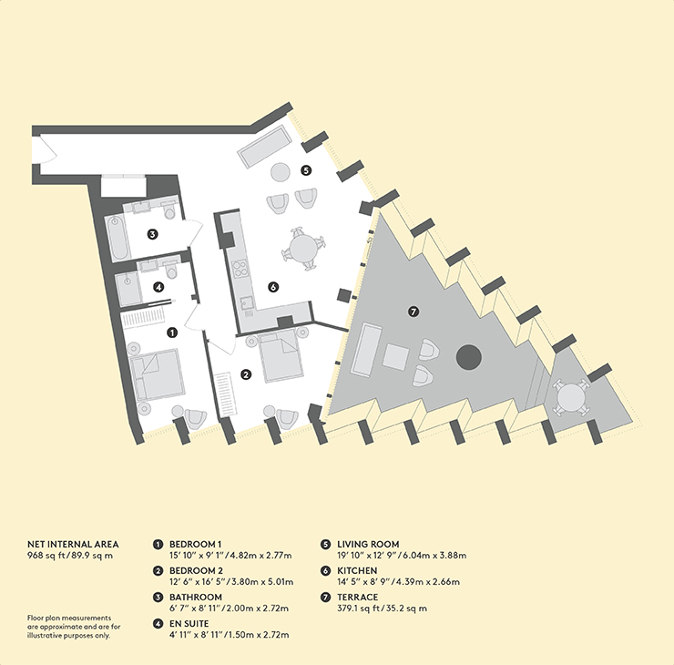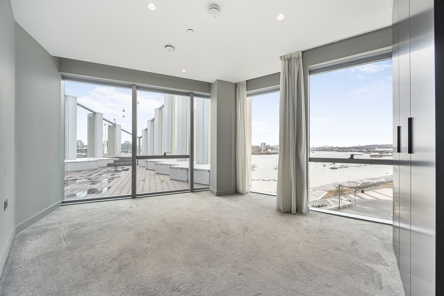 This apartment is truly one of a kind. Featuring a spacious open-plan reception and kitchen area that flows seamlessly onto a vast private terrace with breathtaking river views. The contemporary design is complemented by floor-to-ceiling windows, flooding the space with natural light and showcasing stunning panoramas. Both bedrooms are generously sized and finished to the highest standard, with the master suite boasting a luxurious en-suite bathroom and bespoke built-in wardrobes. The interiors exude sophistication, with 100% wool carpets in the bedrooms and marble finishes in the bathrooms.