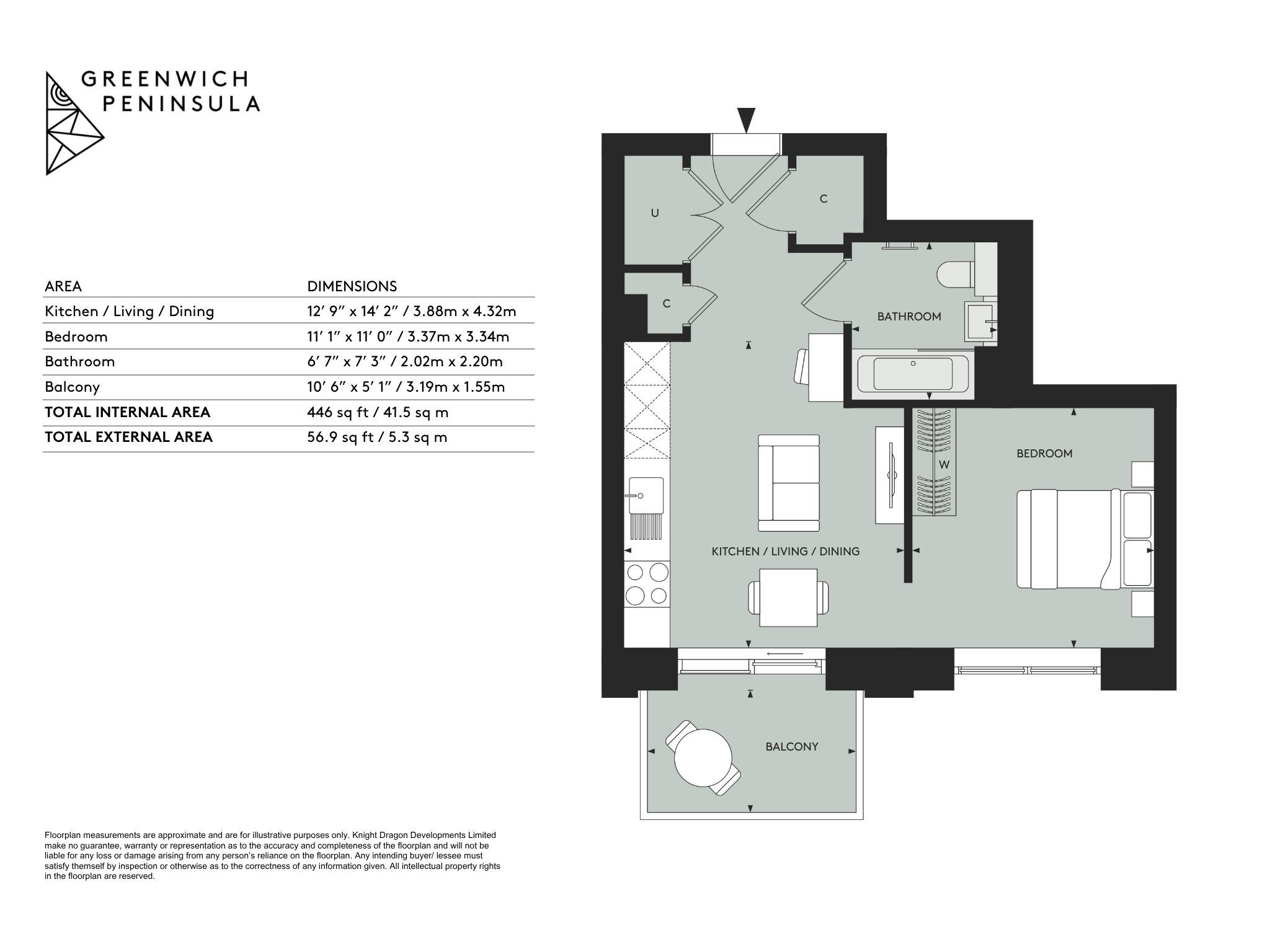 This BRAND NEW, studio apartment sits on the 3rd floor of the building with unobstructed views ouf the peninsula. It features 446 sqft of internal space, including a bathroom, a large open-plan living/kitchen area and built in storage facilities, alongside an additional balcony.