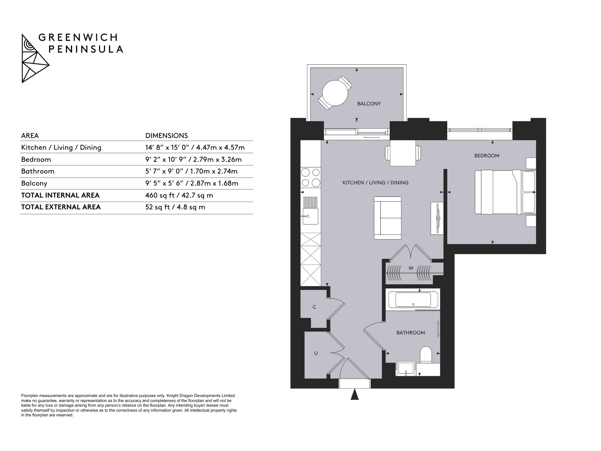 This BRAND NEW, spacious studio apartment sits on the 4th floor of the building. It features 459 sqft of internal space including a bathrooms, a large open-plan living/kitchen area and built in storage facilities, alongside an additional balcony.