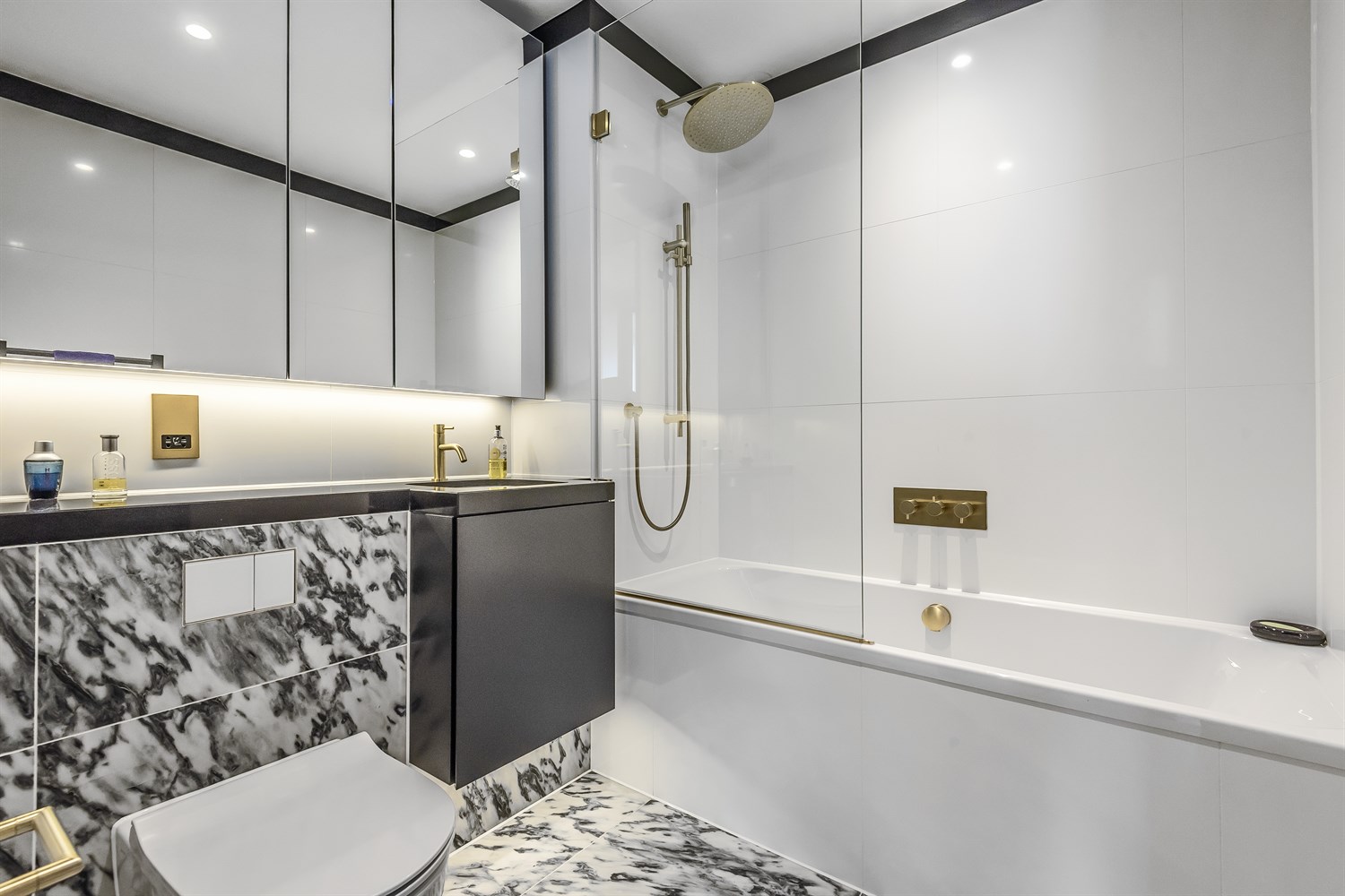 The apartment is located on the 17th floor and is extremely spacious indeed, amounting to 534 square feet and offering breath taking views of the river Thames and central park. This apartment has a light and bright living and kitchen area, lined with real wood flooring, and extra large balcony. The kitchen is ultra modern and stylish, with an all black finish and gold trim and all appliances are built in, including dishwasher. The master bedroom comes complete with built in wardrobes and the master bathroom has shower over bath tub, marble flooring and vanity unit. Large floor to ceiling windows plenty of natural light which help to show off this apartments size and quality.