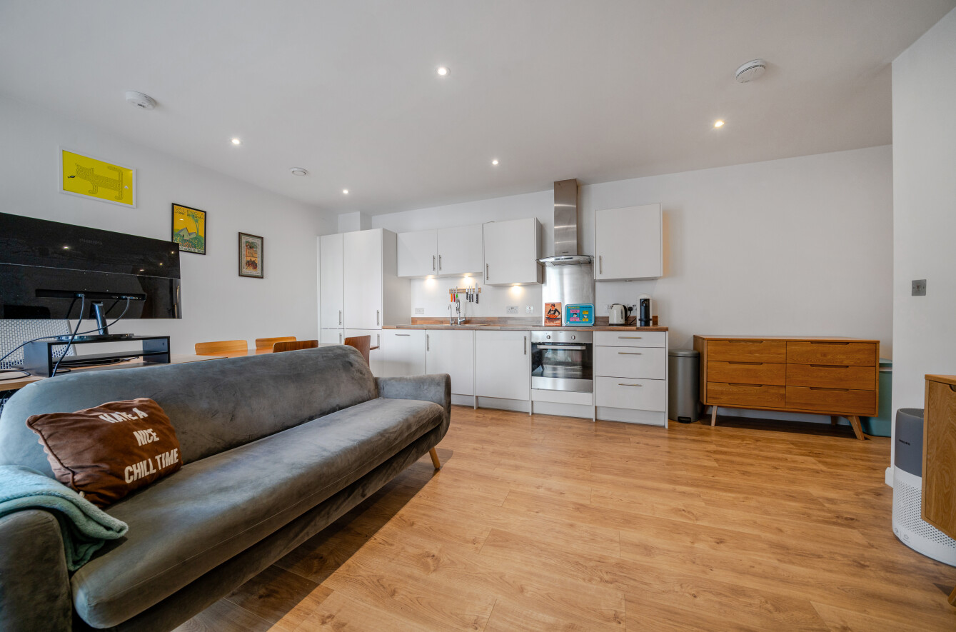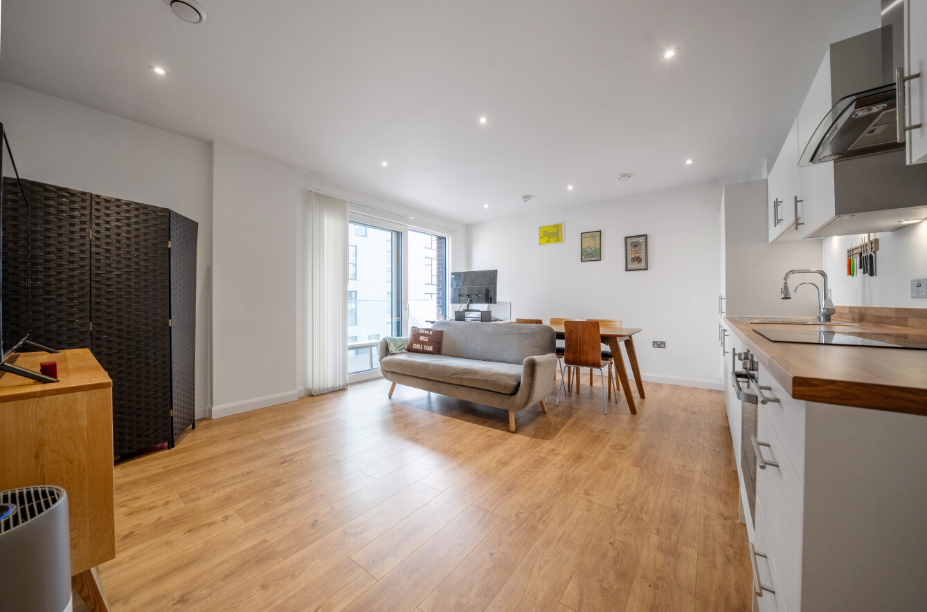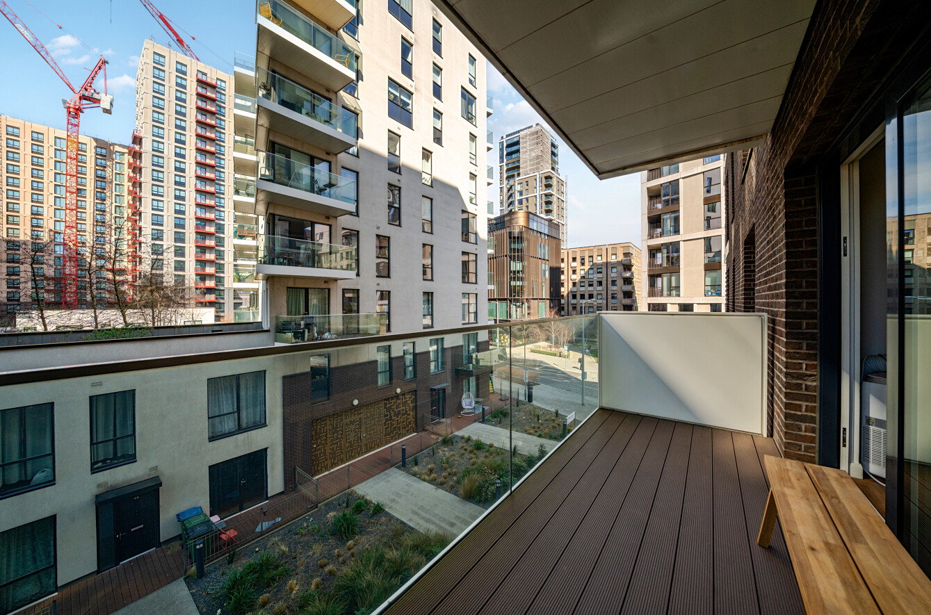The spacious entrance hall opens to an inviting open-plan and airy lounge space. The reception leads to a north-east facing balcony, offering lovely views across Central Park and beyond to Canary Wharf—providing a perfect place to relax and unwind.