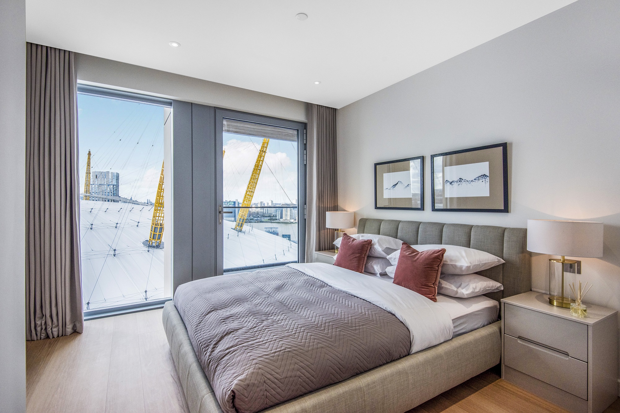 This beautifully designed 14th floor, two-bedroom apartment offers panoramic views of Canary Wharf, the O2 Arena, and the River Thames, thanks to expansive floor-to-ceiling windows and two private balconies. One balcony extends from the open-plan living area, perfect for entertaining or unwinding with a view, while the other is directly accessible from the principal bedroom, offering a serene, elevated outlook.