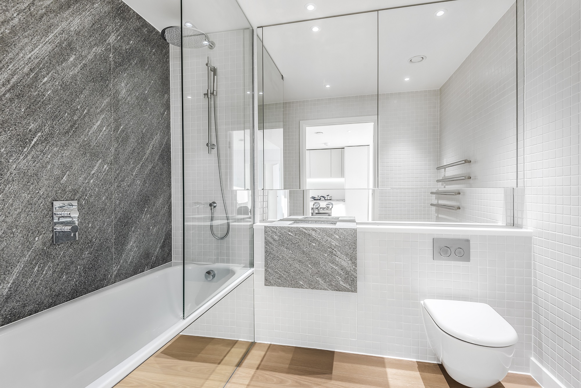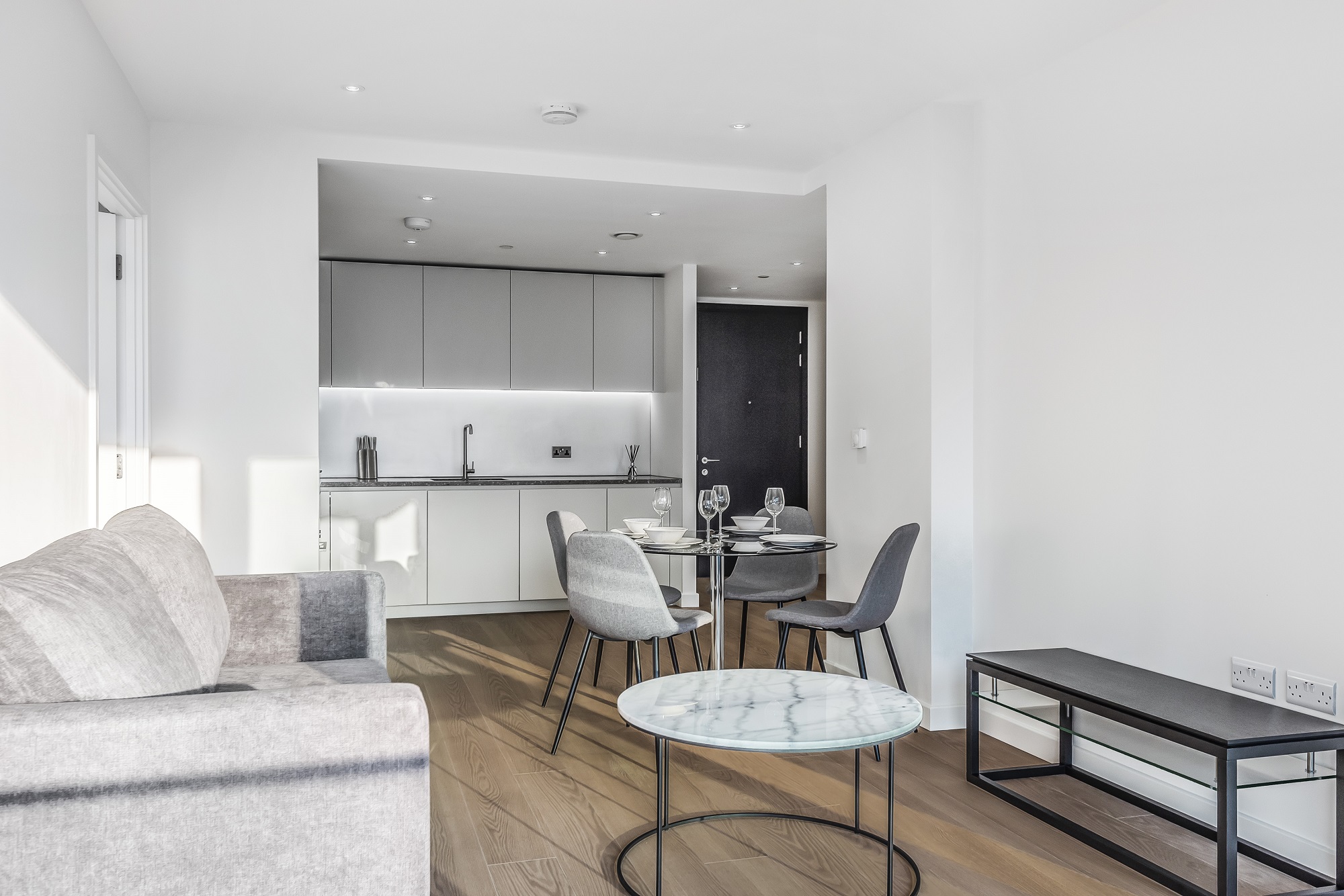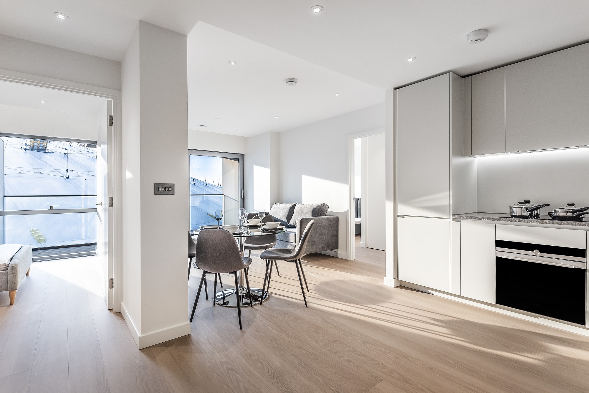The open-plan living space flows effortlessly into a fully integrated kitchen and leads out to a private, decked balcony—ideal for relaxing or entertaining with a view. There’s engineered wood flooring with underfloor heating, and the layout is both stylish and practical.
