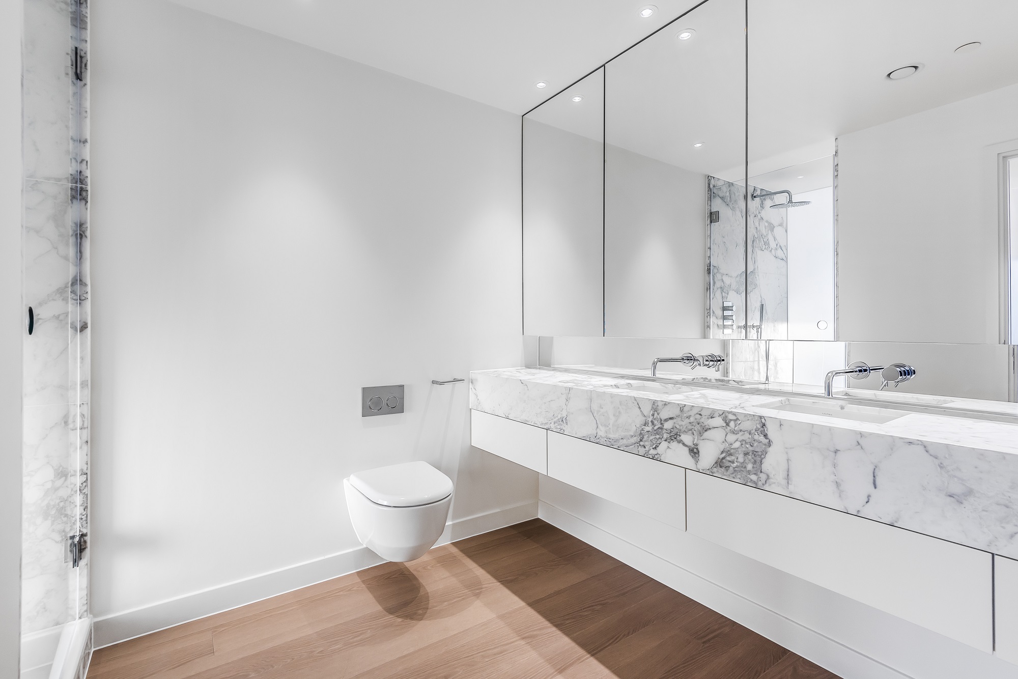 Both bedrooms are generous doubles with built-in wardrobes, and the principal bedroom features a sleek en-suite with double marble-inset sinks and a walk-in shower. You’ll also find a well-designed family bathroom, a handy utility cupboard, and plenty of storage throughout the home.