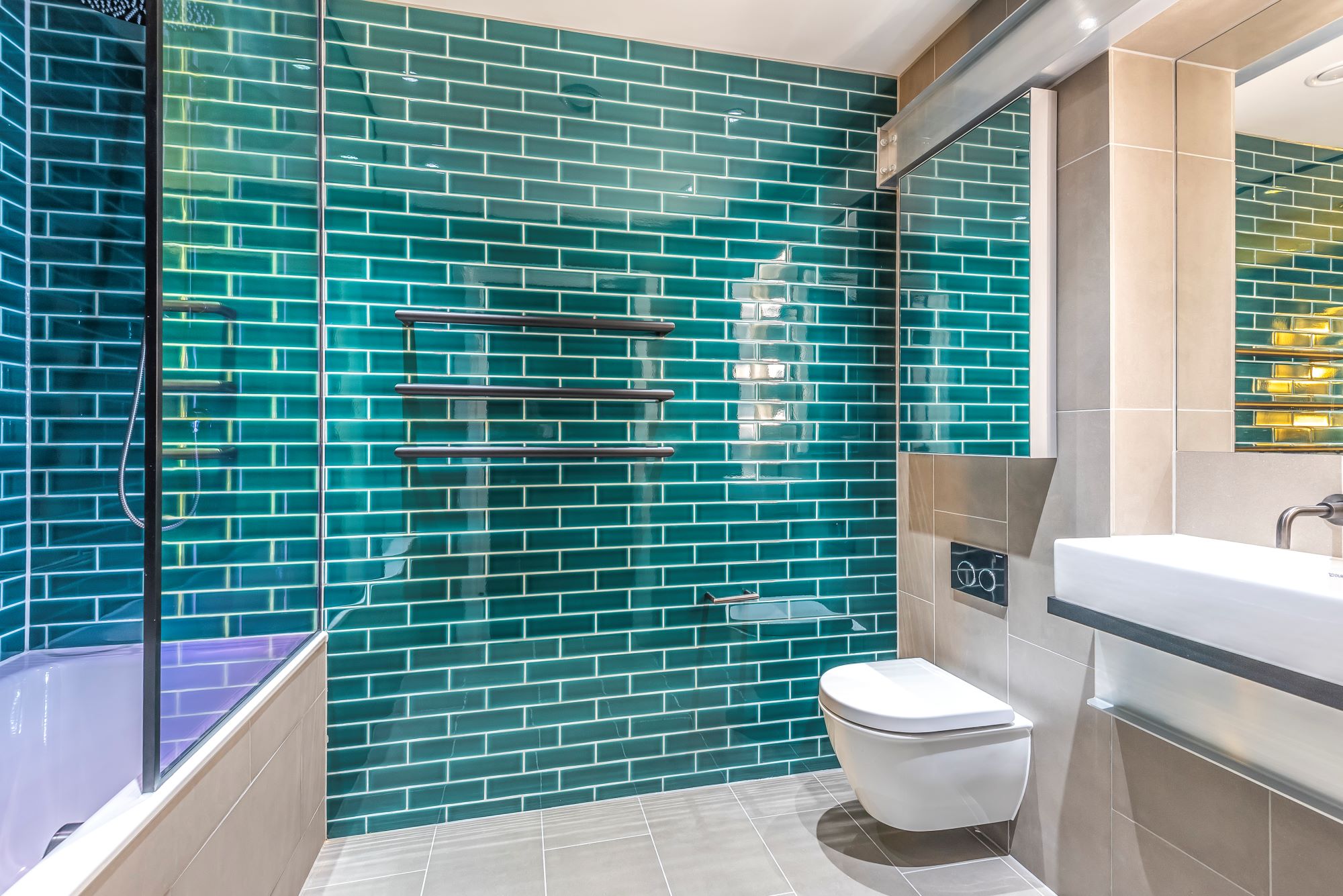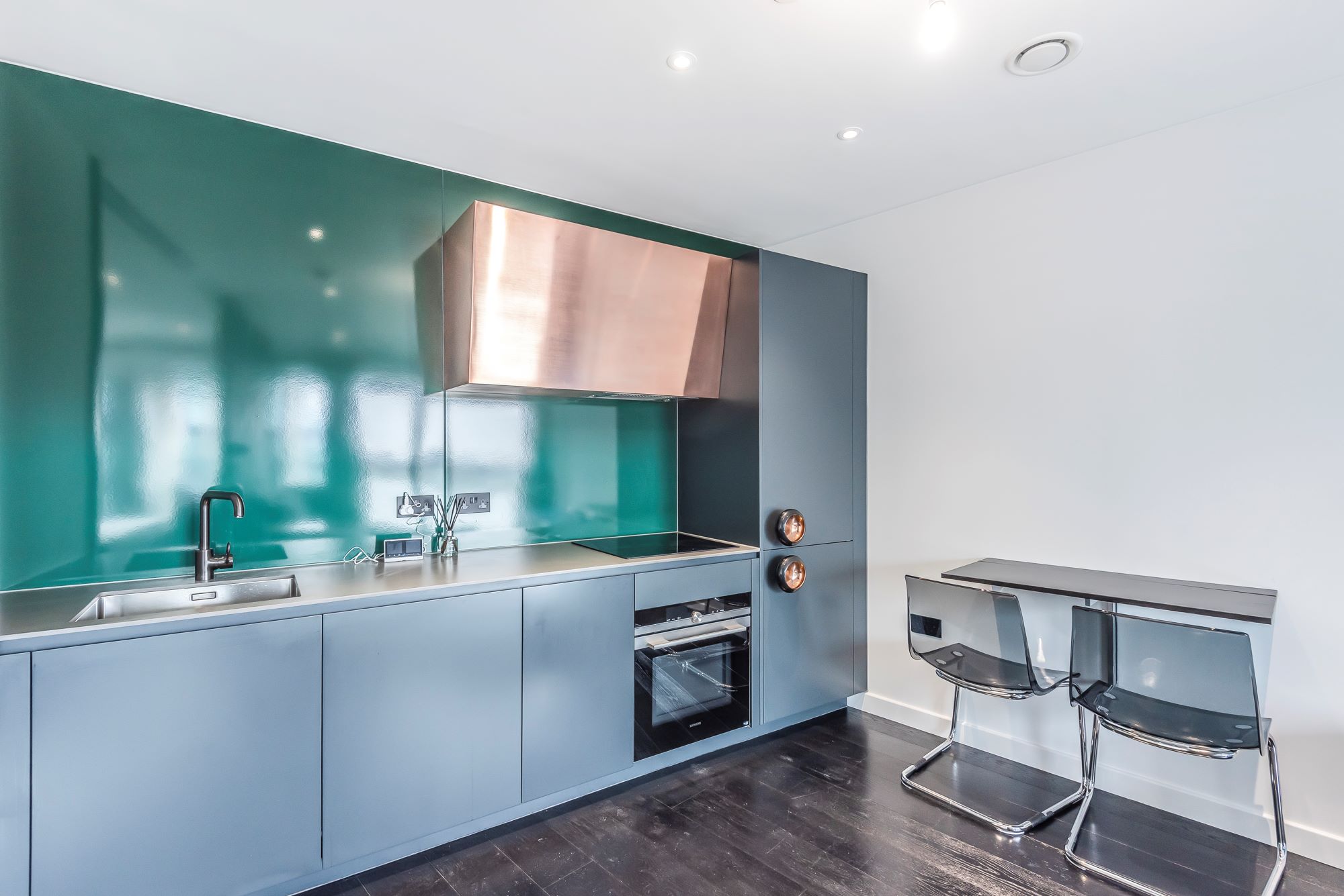 The kitchen utilises the traditional enamelling processes of London's sign makers and hand-crafted copper cabinetry and the bathroom creates an immersive colour experience. The rich tones of the glazed tiles are complimented by the dichroic glass which adds a hint of technicolour to the space.