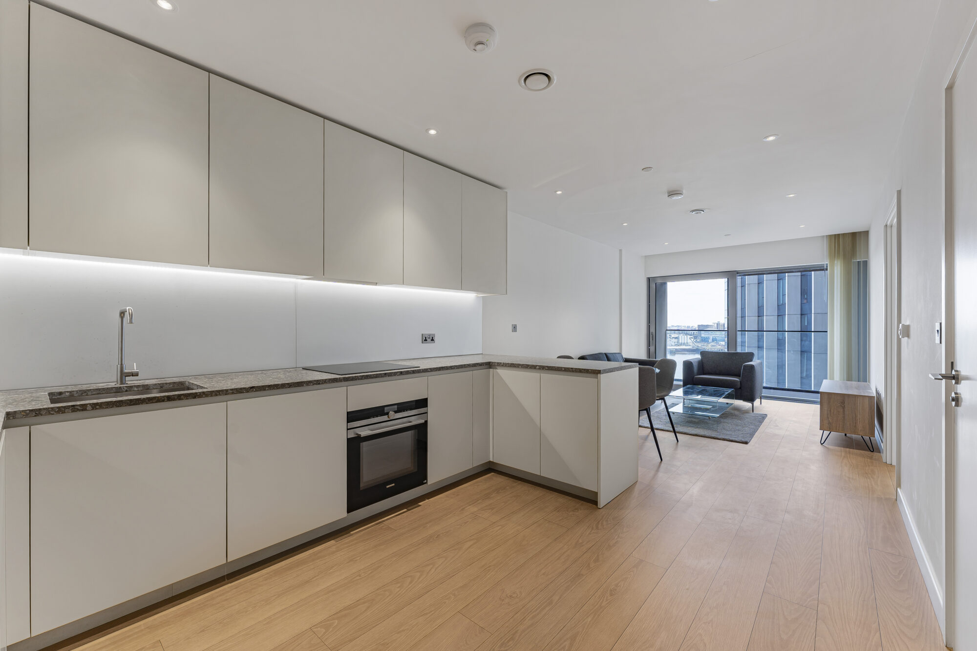 The bright and airy open-plan living area leads to a private balcony with views of the river Thames. A sleek kitchen, spacious bedroom, and stylish bathroom with rich glazed tiles to complete the home’s modern, design-led aesthetic.