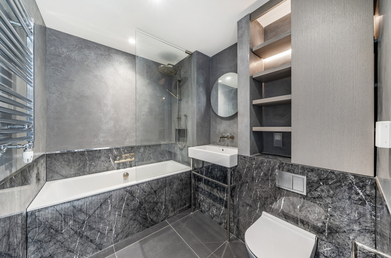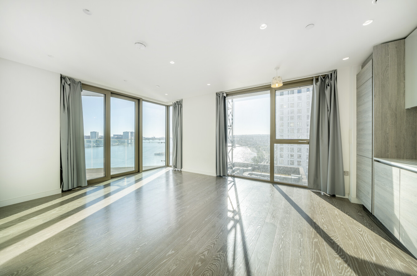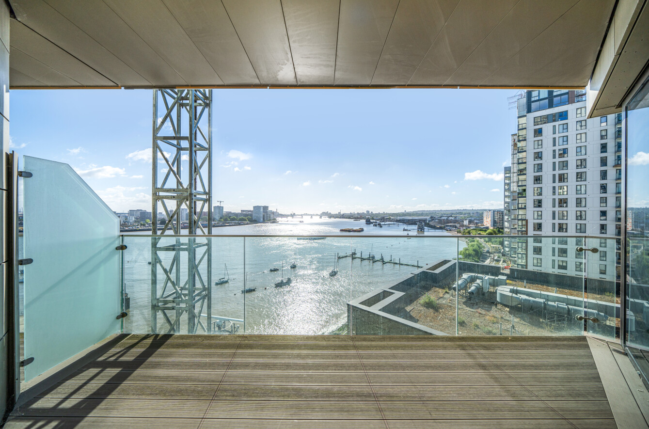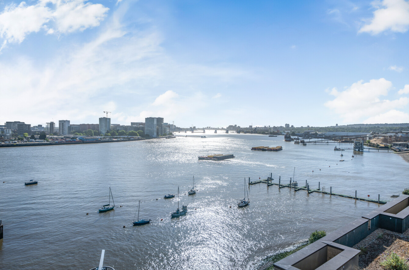 Offering beautiful East facing views across the River Thames, this stylish property features an interior designed by Conran & Partners including Grigio Carnico marble splashbacks and Corian worktops, grey oak timber flooring and marble dado pannelling.