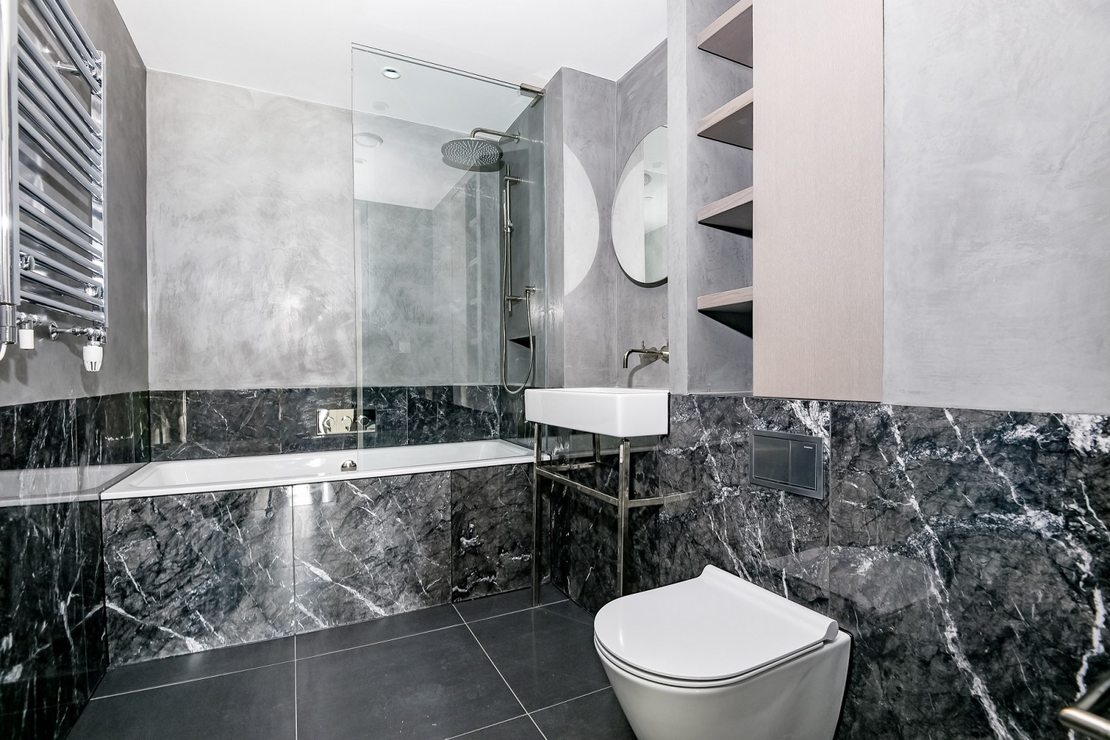 Fitted out in the stylish dark specification and with interiors designed by renowned architects Conran and Partners, the property features grey oak engineered timber flooring, warm grey wool carpets, gorgeous dark Grigio Carnico marble dado panelling in the bathroom and ensuite, dark Grigio Carnico marble splashback in the kitchen, and built in oak timber veneer wardrobes in two of the bedrooms.