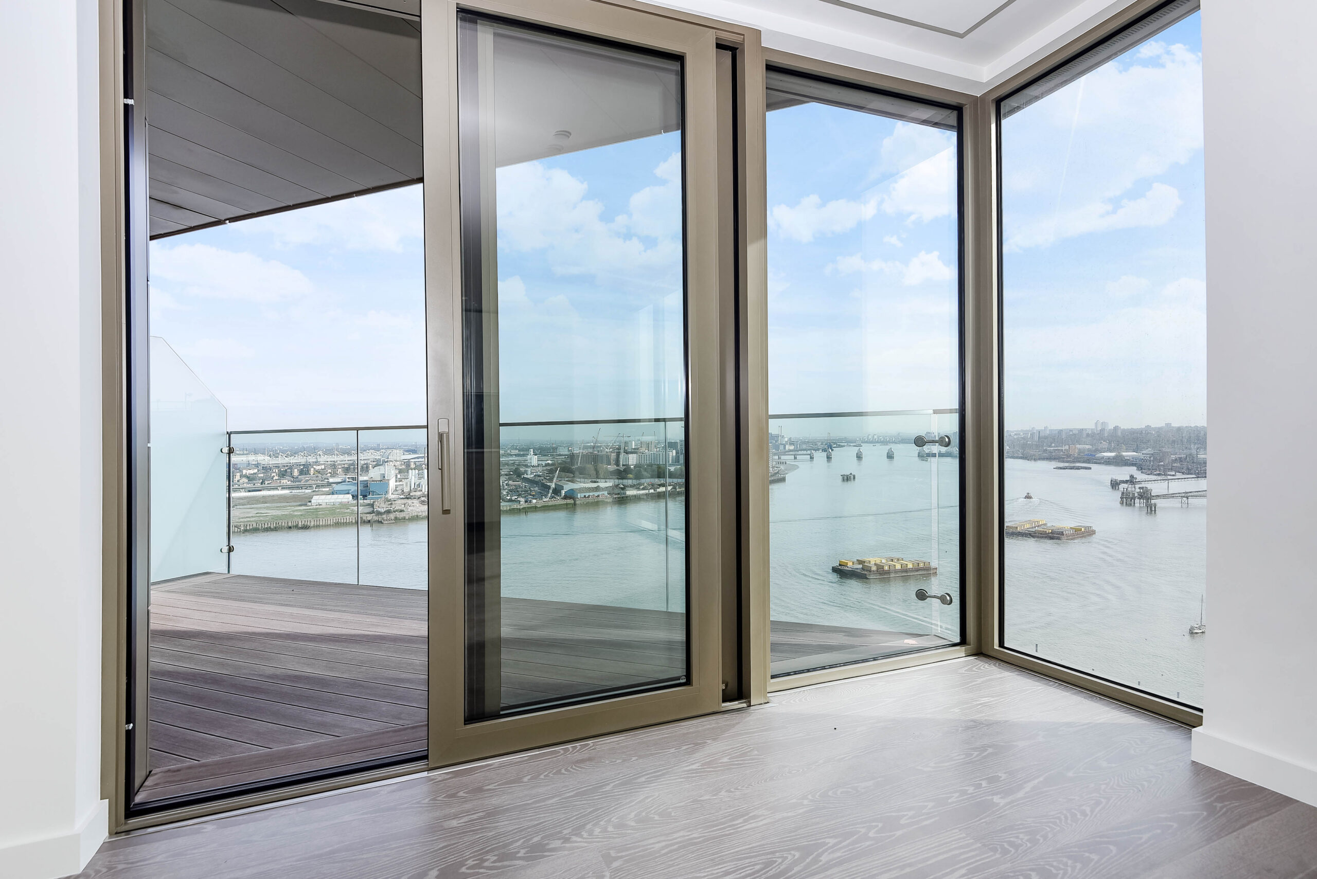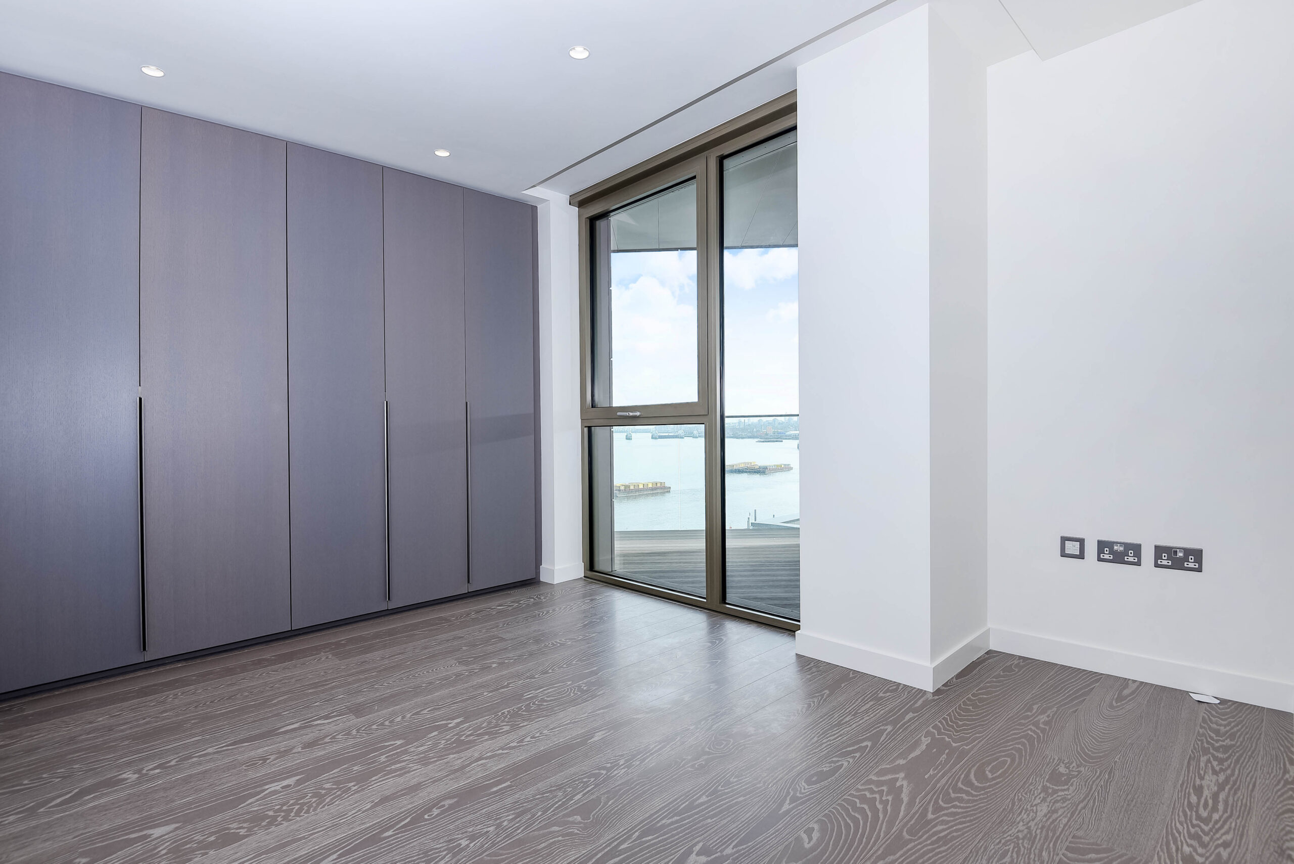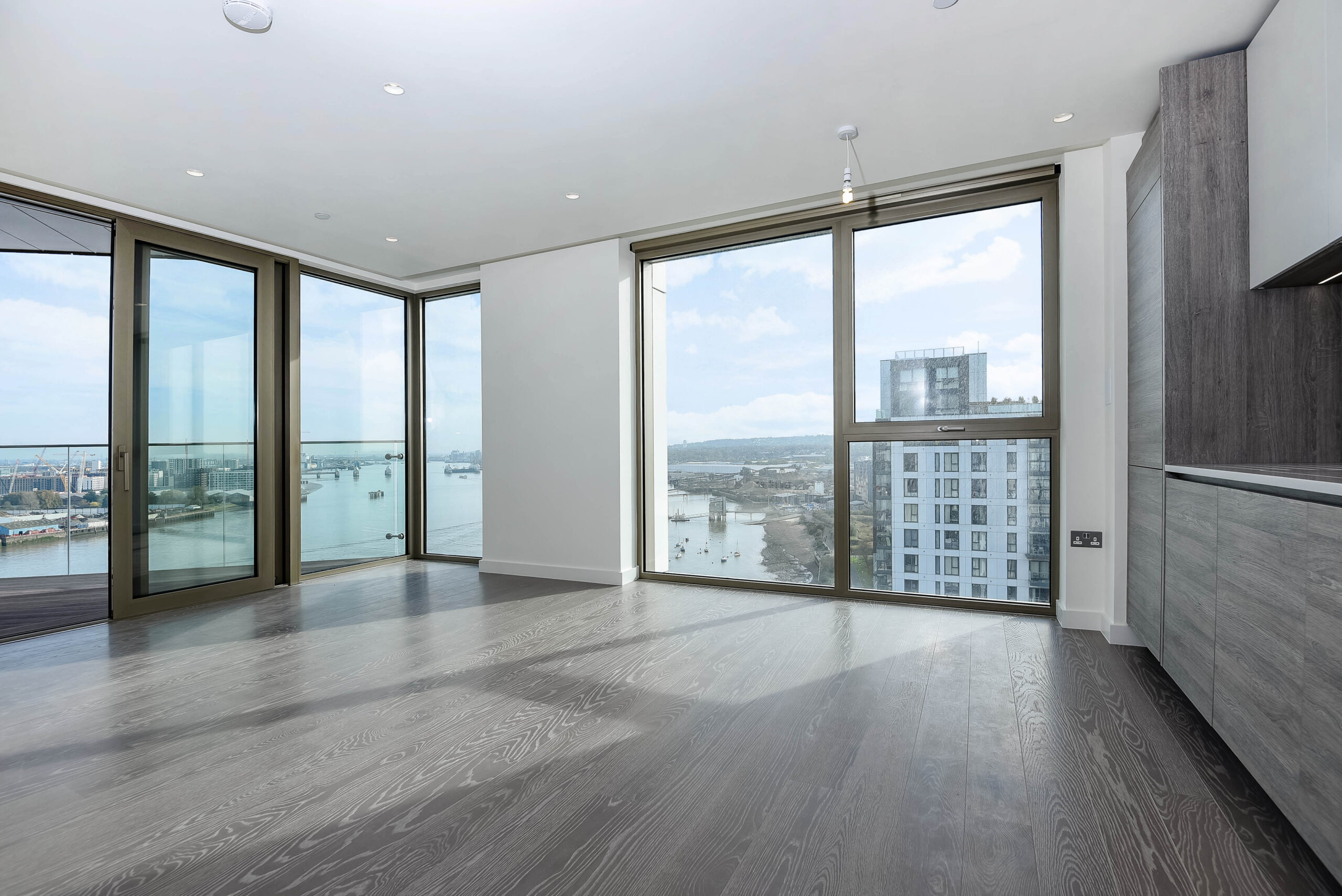 Offering beautiful East facing views across the River Thames, this stylish property features an interior designed by Conran & Partners including Grigio Carnico marble splashbacks and Corian worktops, grey oak timber flooring and marble dado pannelling.