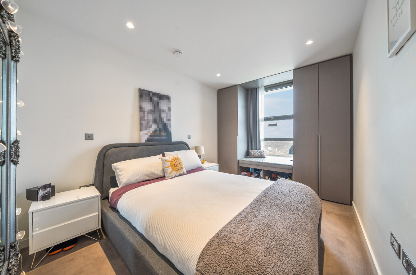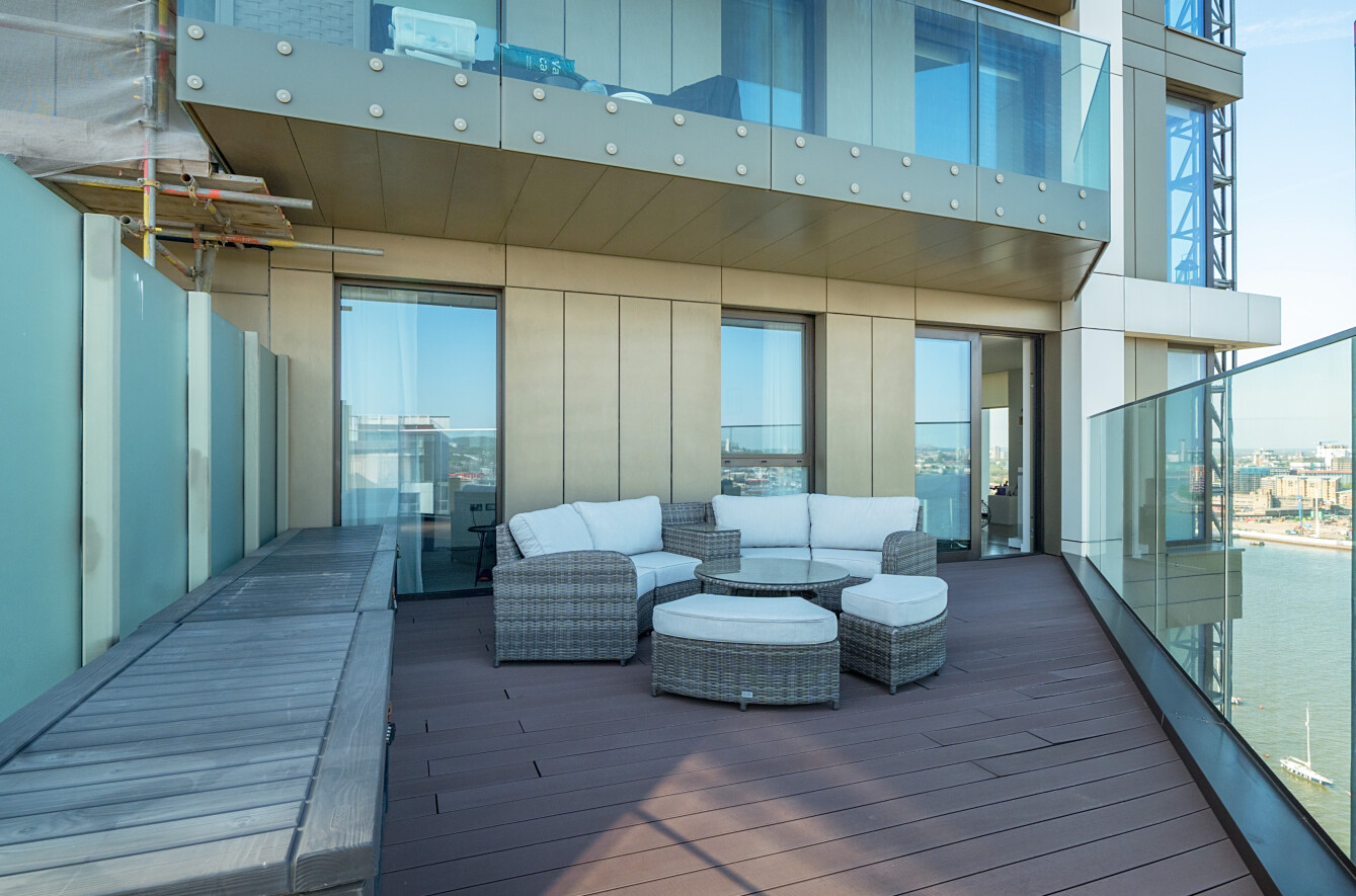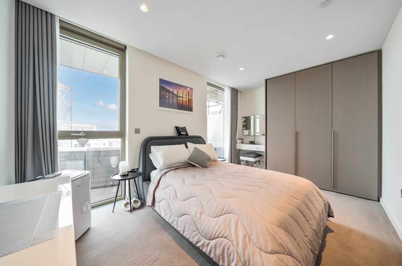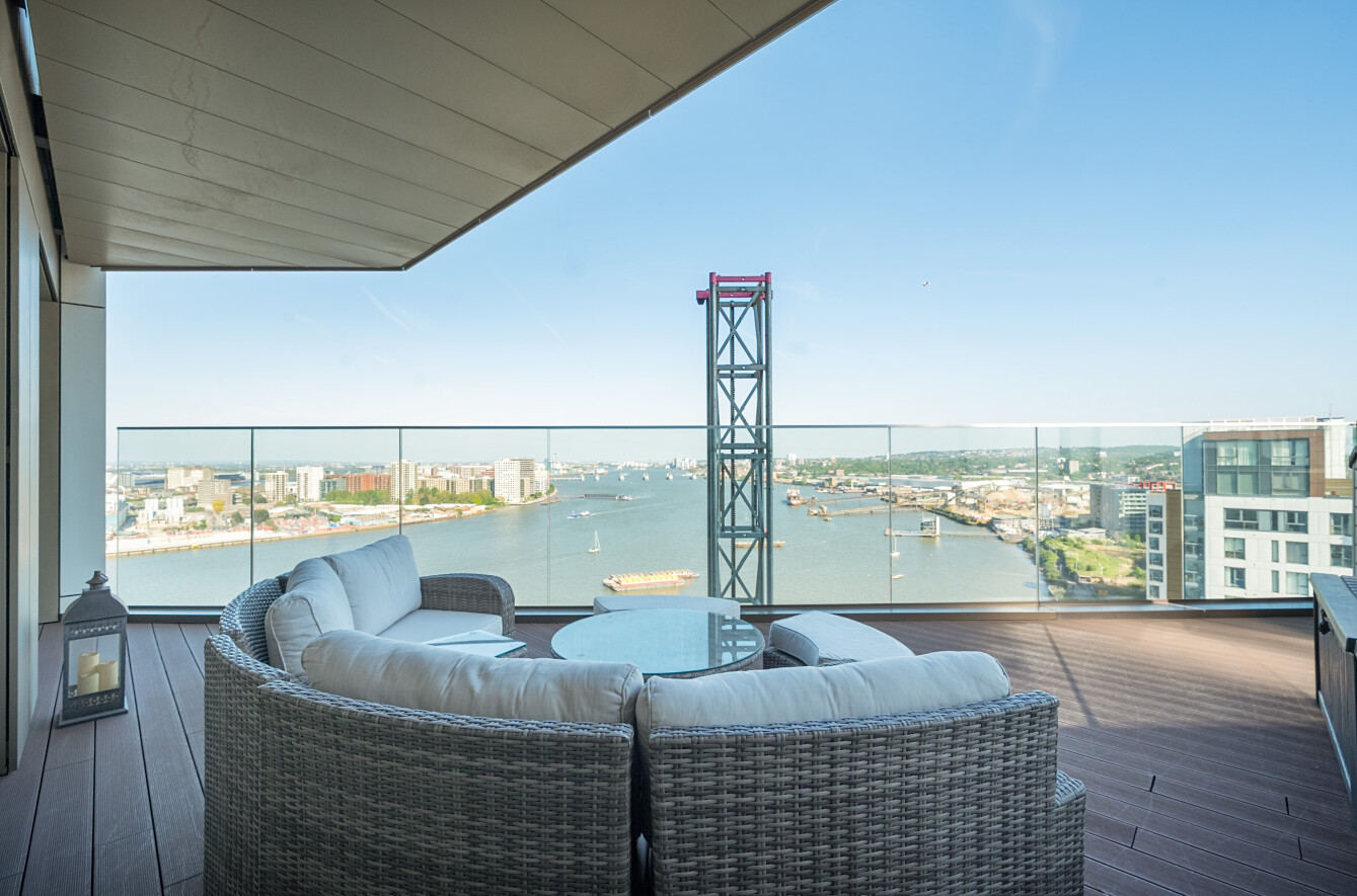 This exceptional 2-bedroom apartment on the 17th floor offers an elevated lifestyle with uninterrupted, panoramic views of the River Thames from its uniquely large private terrace. Facing South East, the apartment is flooded with natural light throughout the day, thanks to expansive floor-to-ceiling windows that frame breathtaking river vistas and skyline sunrises.