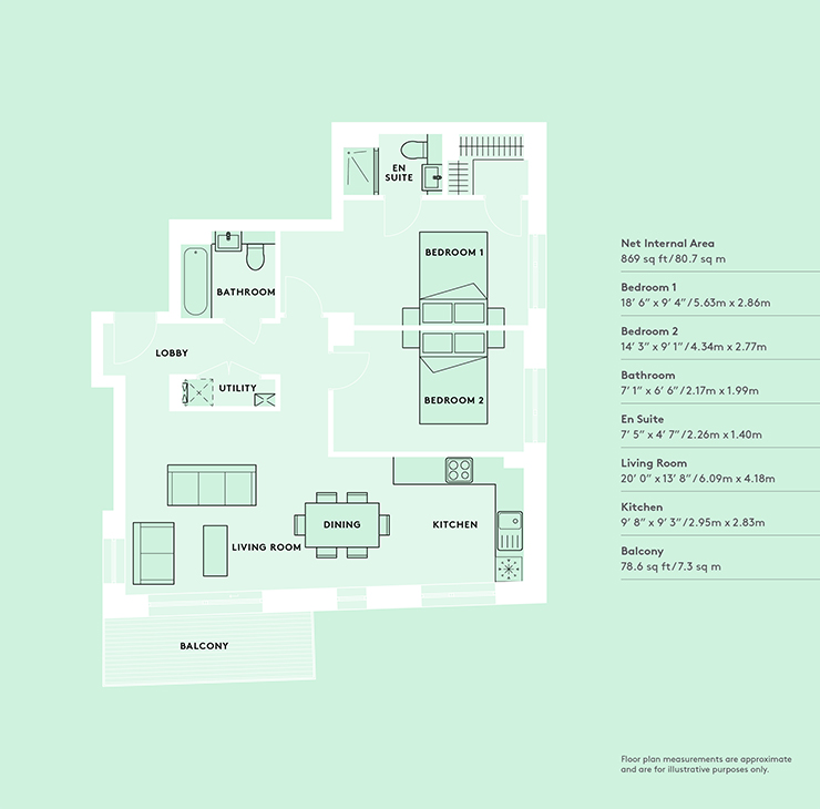 This very generously sized home provides 869 square ft of space, it sits on the 7th floor of the popular Moore Building and enjoys superb panoramic views. The spacious entrance hall with utilities/ storage cupboard, opens to the smart open plan reception and kitchen areas. The fully fitted German Alno kitchen has Silestone work surfaces. With a dual aspect and decked South West facing balcony, there is plenty of natural light flowing throughout the apartment. Both bedrooms are double rooms, the master suite benefitting a walk in wardrobe and en-suite shower room/WC. There is ample space in either bedroom to accommodate a desk for those needing to work from home or if you prefer, plenty of space in the sunny reception room or hallway. Warm toned, hardwood engineered timber flooring, with under floor heating runs through the apartment, complementing the clean lines of the neutral décor and there are wool carpets fitted to both bedrooms. A centralised terrestrial and satellite television system is in place and there is high speed broadband fibre, a resident's lounge area on the ground floor, and secure cycle storage is available.