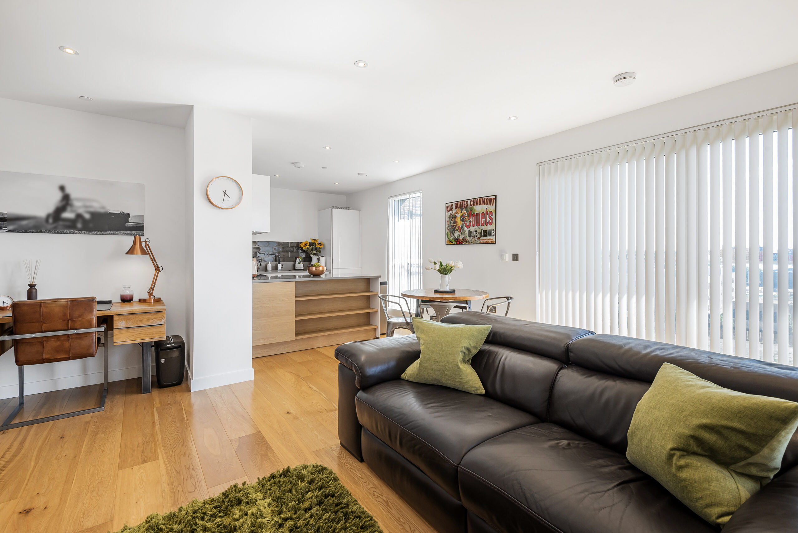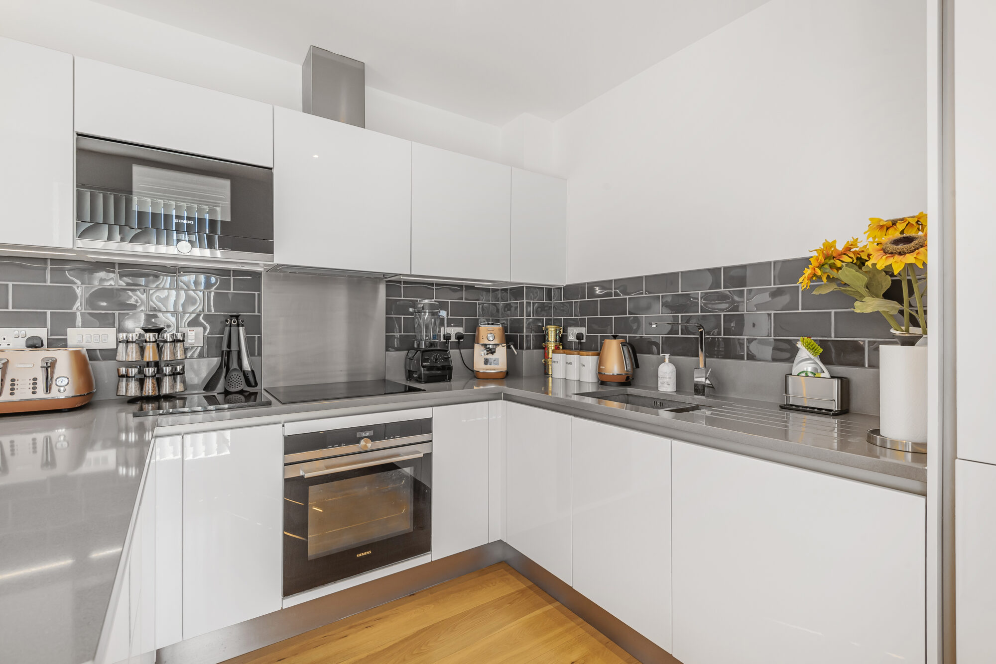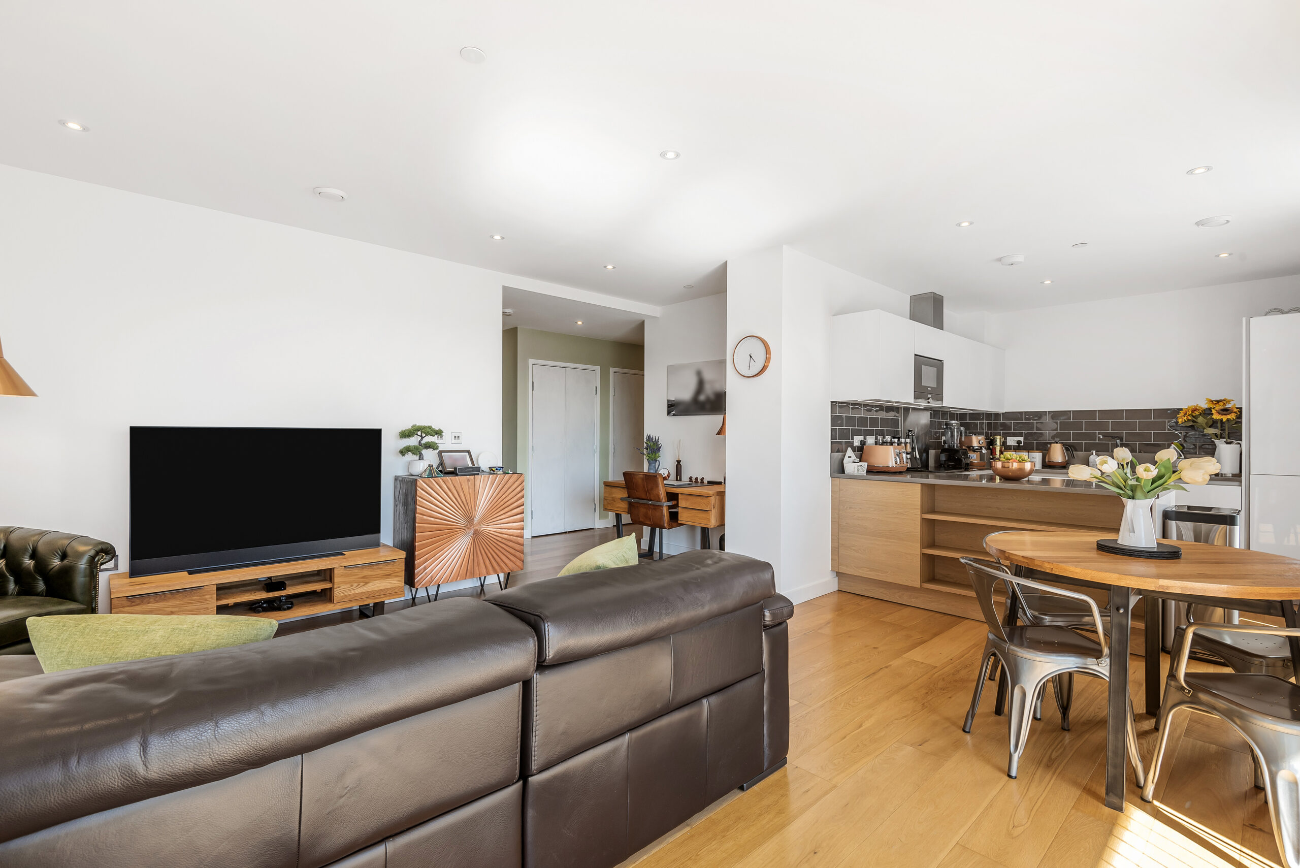 This very generously sized home provides 819 square ft of space, and sits in a corner position of the popular Moore Building and enjoys superb panoramic views. The spacious entrance hall with utilities and very useful additional storage cupboard, opens to the smart open plan reception and kitchen areas. The fully fitted German Alno kitchen has Silestone work surfaces and breakfast bar. With a dual aspect and decked South West facing balcony, there is plenty of natural light flowing throughout the apartment, and the fitted thermal blinds assist in keeping the home both cool in summer and warm in winter. Both bedrooms are double rooms, both with custom built fitted wardrobes, the master suite having en-suite shower room/WC. There is ample space in either bedroom to accommodate a desk for those needing to work from home or if you prefer, plenty of space in the sunny reception room or hallway. Warm toned, hardwood engineered timber flooring, with under floor heating runs through the apartment, complementing the clean lines of the neutral décor. A centralised terrestrial and satellite television system is in place and there is high speed broadband fibre, a resident's lounge area on the ground floor, and secure cycle storage is available.This property comes with one of the limited number, secure parking spaces.