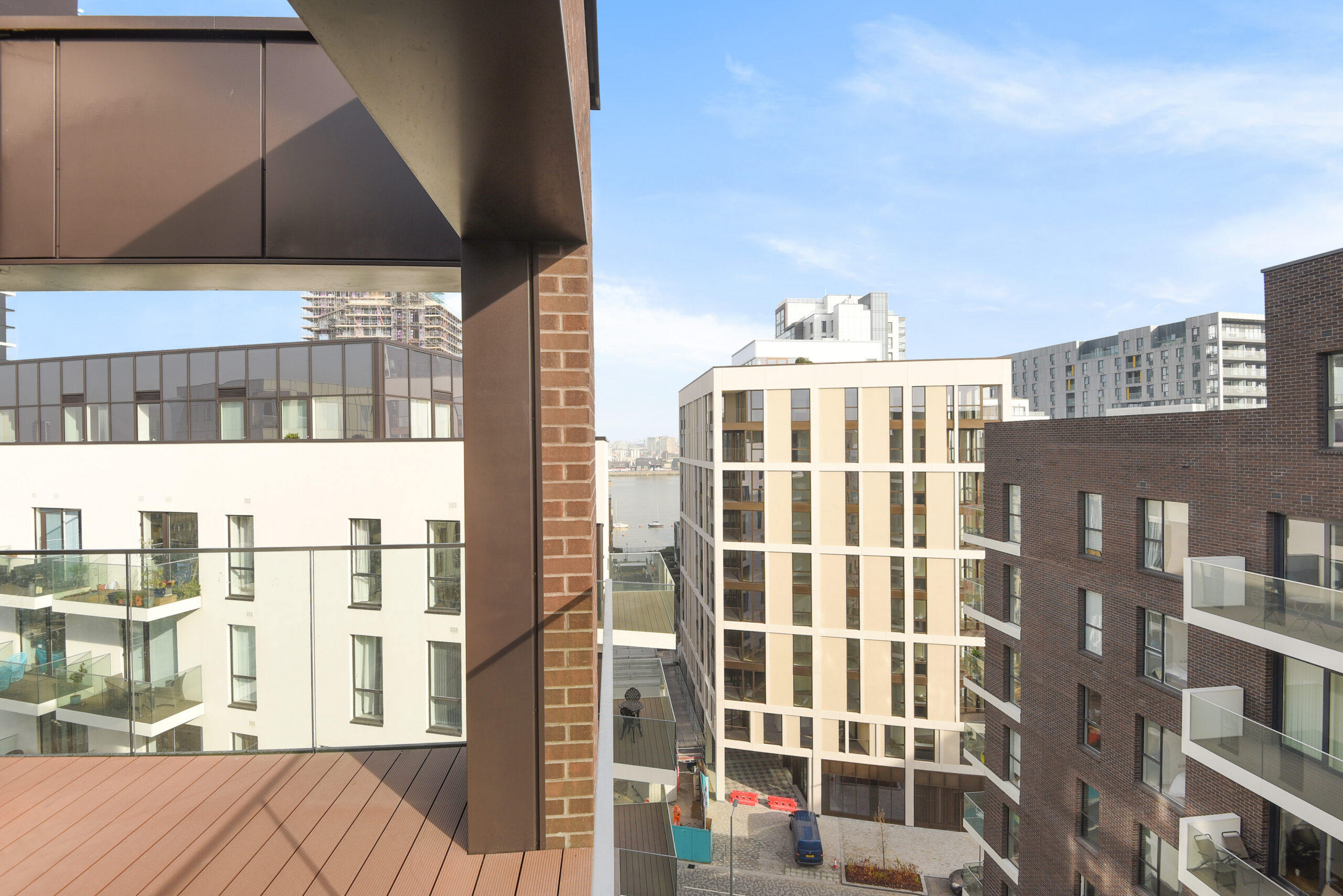 The apartment includes an open-plan kitchen and living area, two double bedrooms with fitted wardrobes, and an en-suite to the principal bedroom. The East-facing balcony offers lovely views across the neighbourhood and a partial view of the river Thames.'