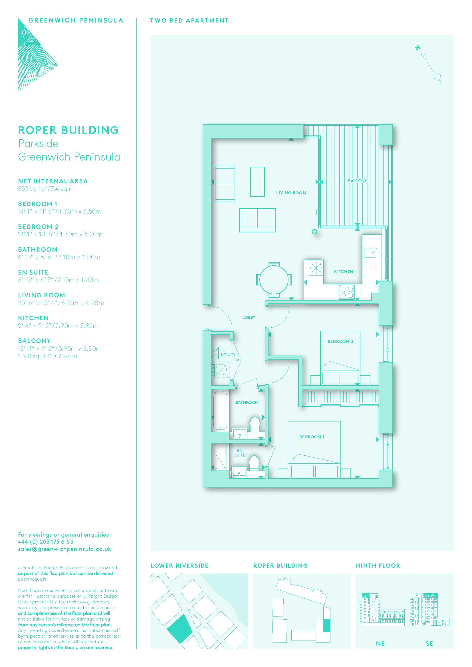 This bright and airy two-bedroom apartment is on the 9th floor of the popular 'Roper' building in Greenwich Peninsula's 'Parkside' neighbourhood, offering a sunny East facing aspect.