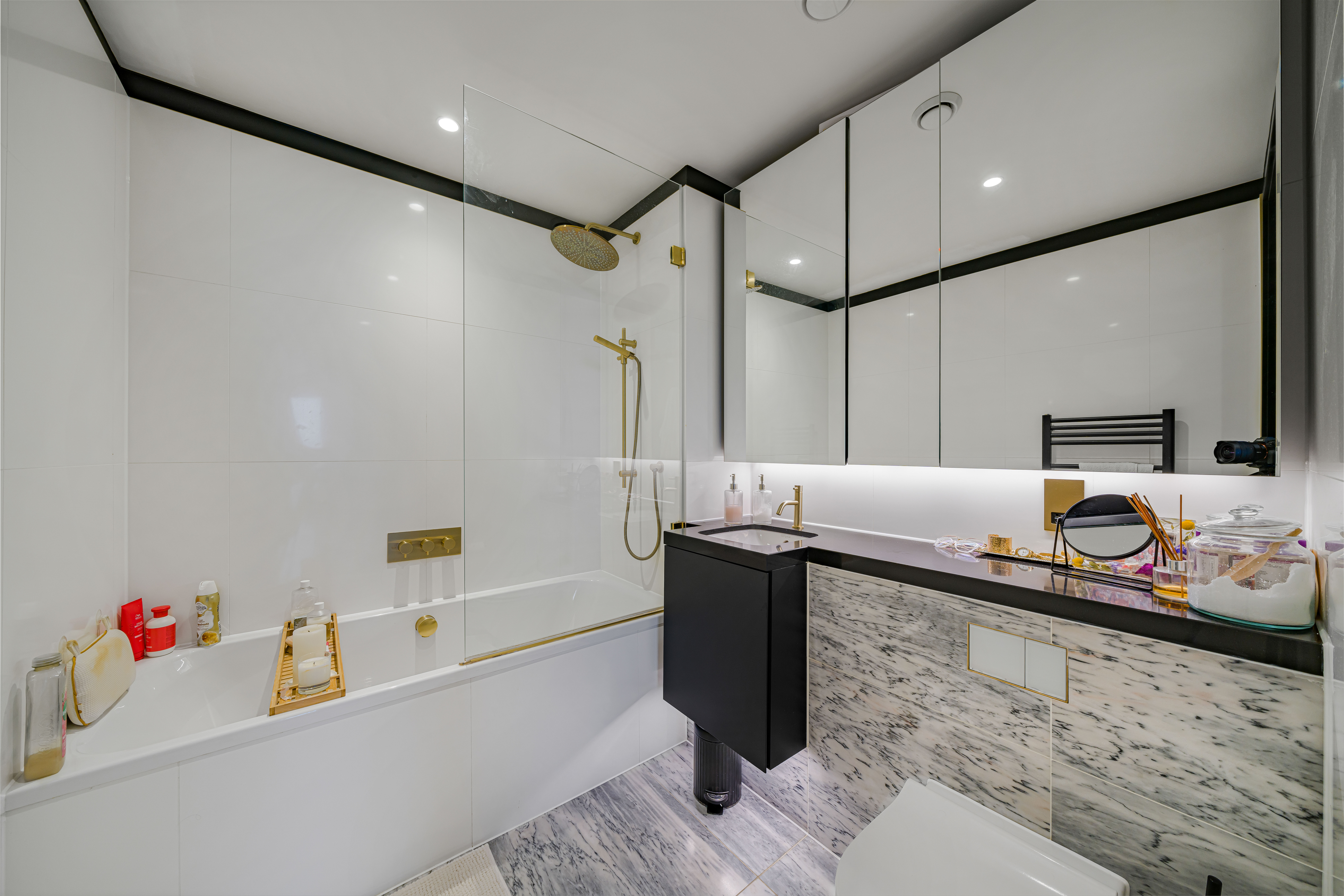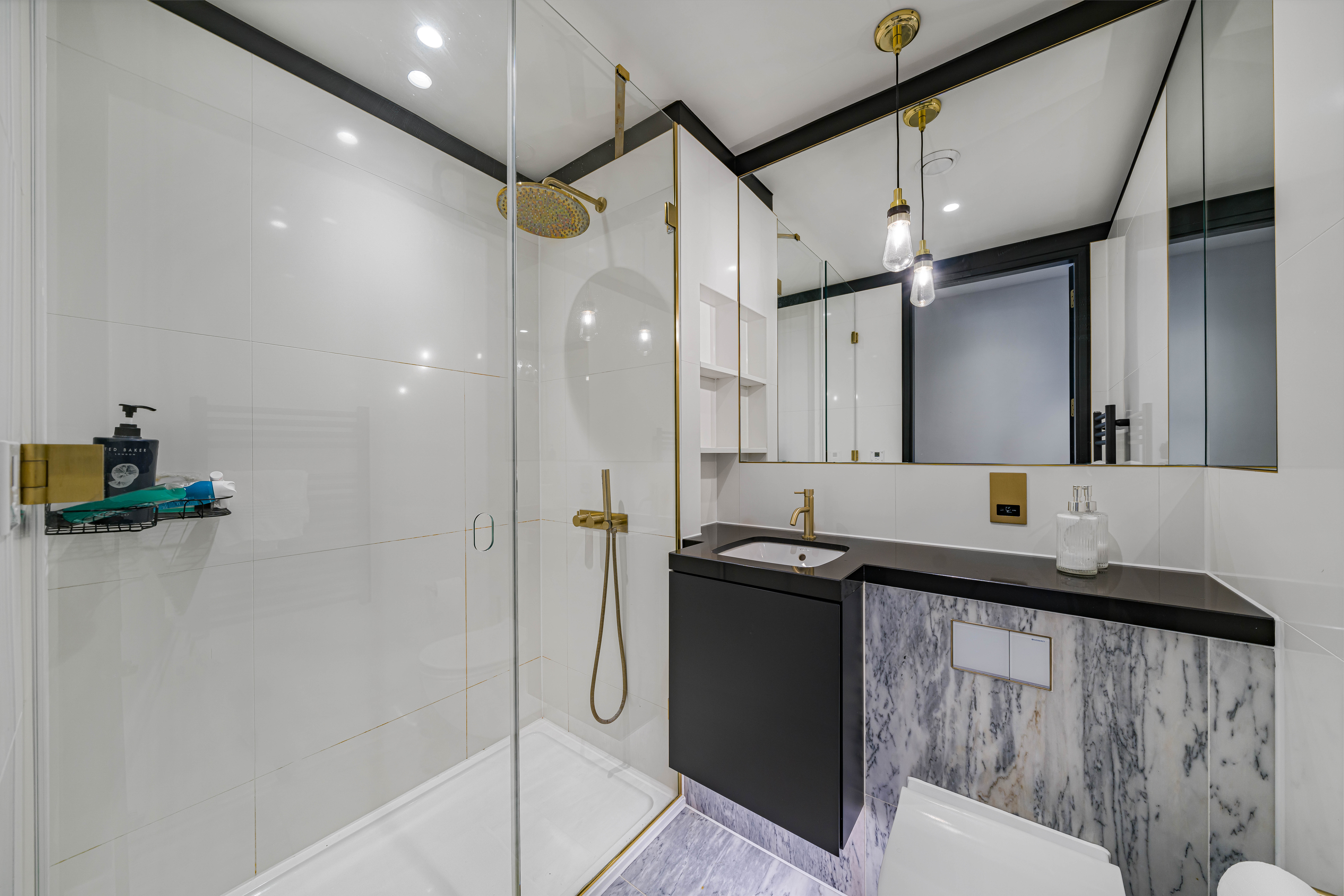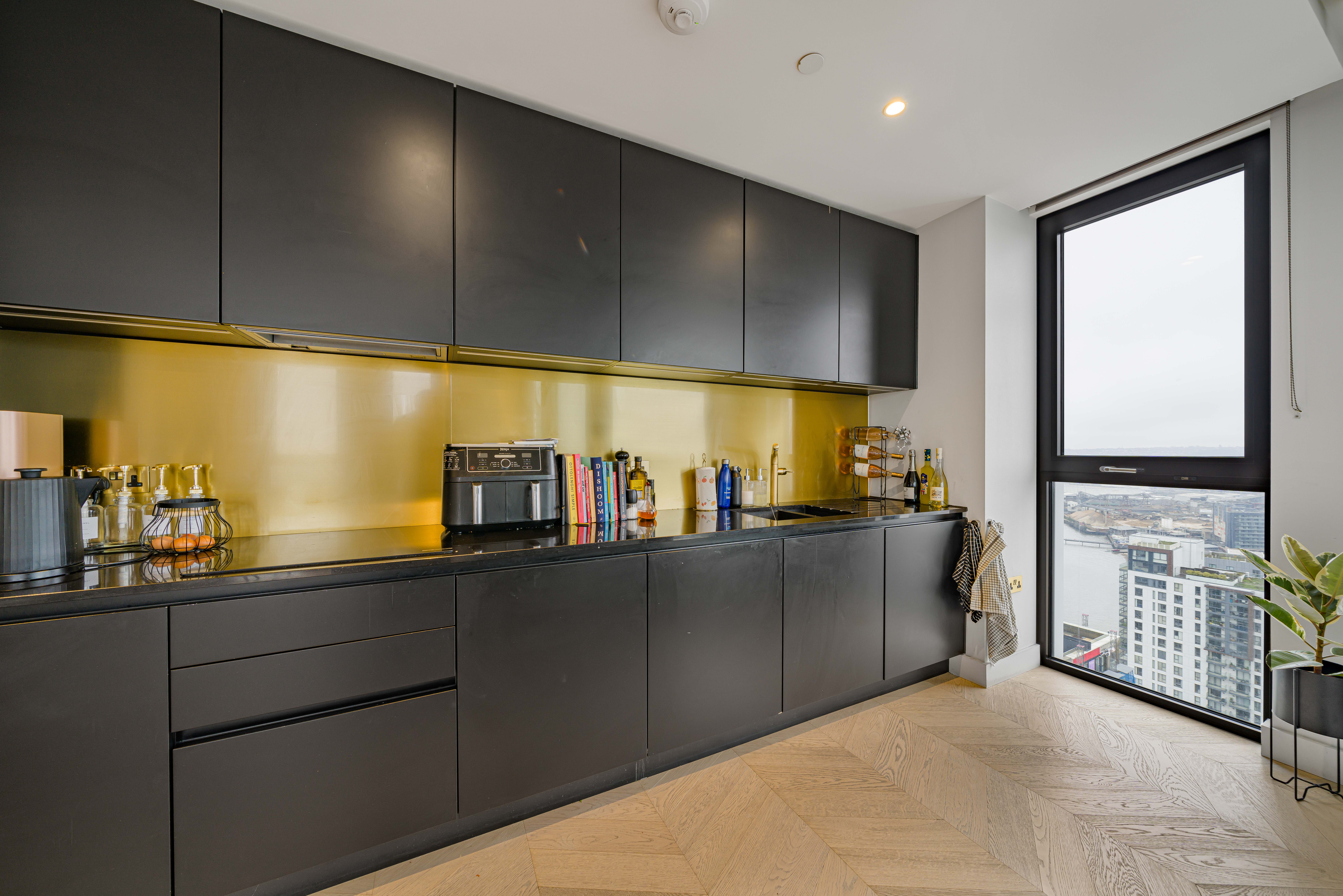 The interiors of The Waterman were designed by Conran & Partners and inspired by the vibrancy of the river and parkside surroundings, and the colours create bold monochrome contrasts with the tactile brushed brass splashback, taps and light fittings.